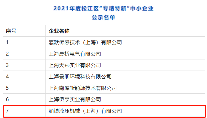 《松江區(qū)“專精特新”中小企業(yè)發(fā)展專項(xiàng)支持實(shí)施細(xì)則(2020年版)》(滬松經(jīng)〔2020〕165號(hào)),區(qū)經(jīng)委組織開展了2021年度松江區(qū)“專精特新”中小企業(yè)申報(bào)和復(fù)核工作。涌鎮(zhèn)液壓充分發(fā)揮自身優(yōu)勢(shì),堅(jiān)持獨(dú)立自主的研發(fā)與創(chuàng)新設(shè)計(jì),憑借高效的產(chǎn)品創(chuàng)新能力和廣泛的市場(chǎng)認(rèn)可度,成功申報(bào)并獲得上海市松江區(qū)“專精特新”的稱號(hào)。